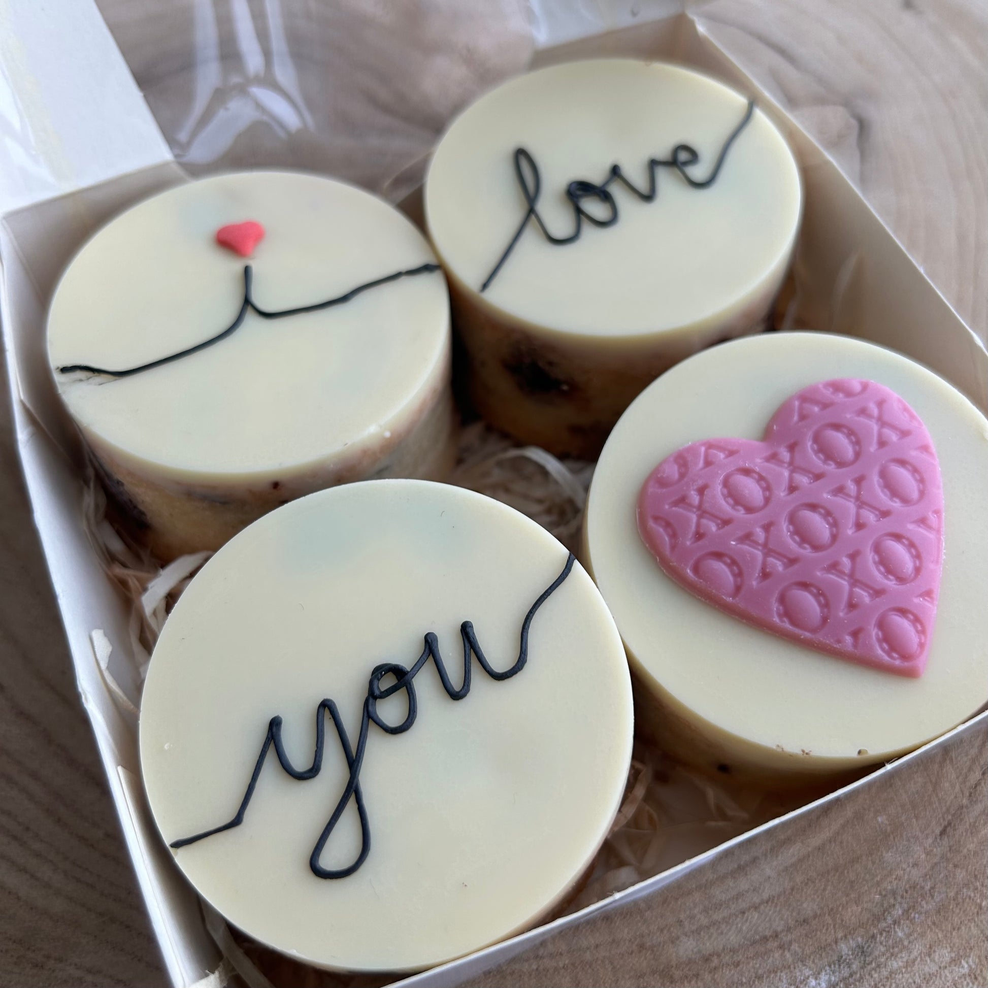 Unsere Valentine’s Cookie Box besteht aus vier handgefertigten Cookies, gebacken mit feiner Butter und hochwertiger Kuvertüre. Außen leicht knusprig, innen wunderbar saftig – echte Lieblingscookies, die von Herzen kommen.